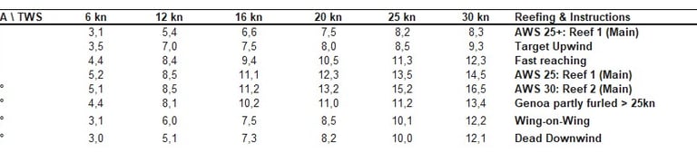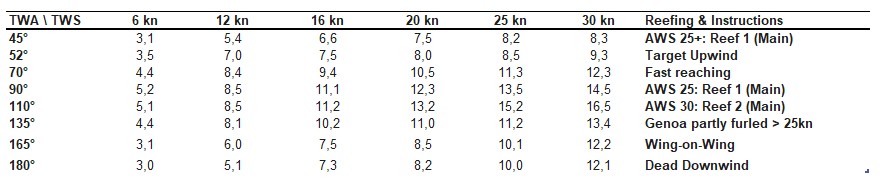 Standard setup: 54 m² J1 Genoa + 73 m² Mainsail. Use the AWS (Apparent Wind) for reefing triggers.